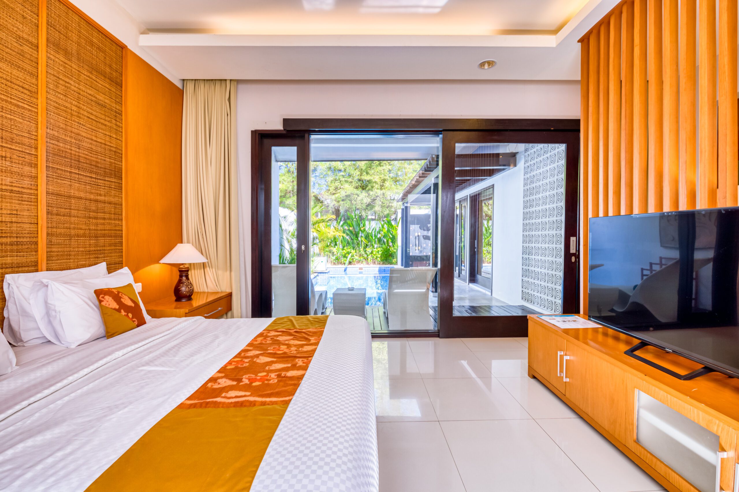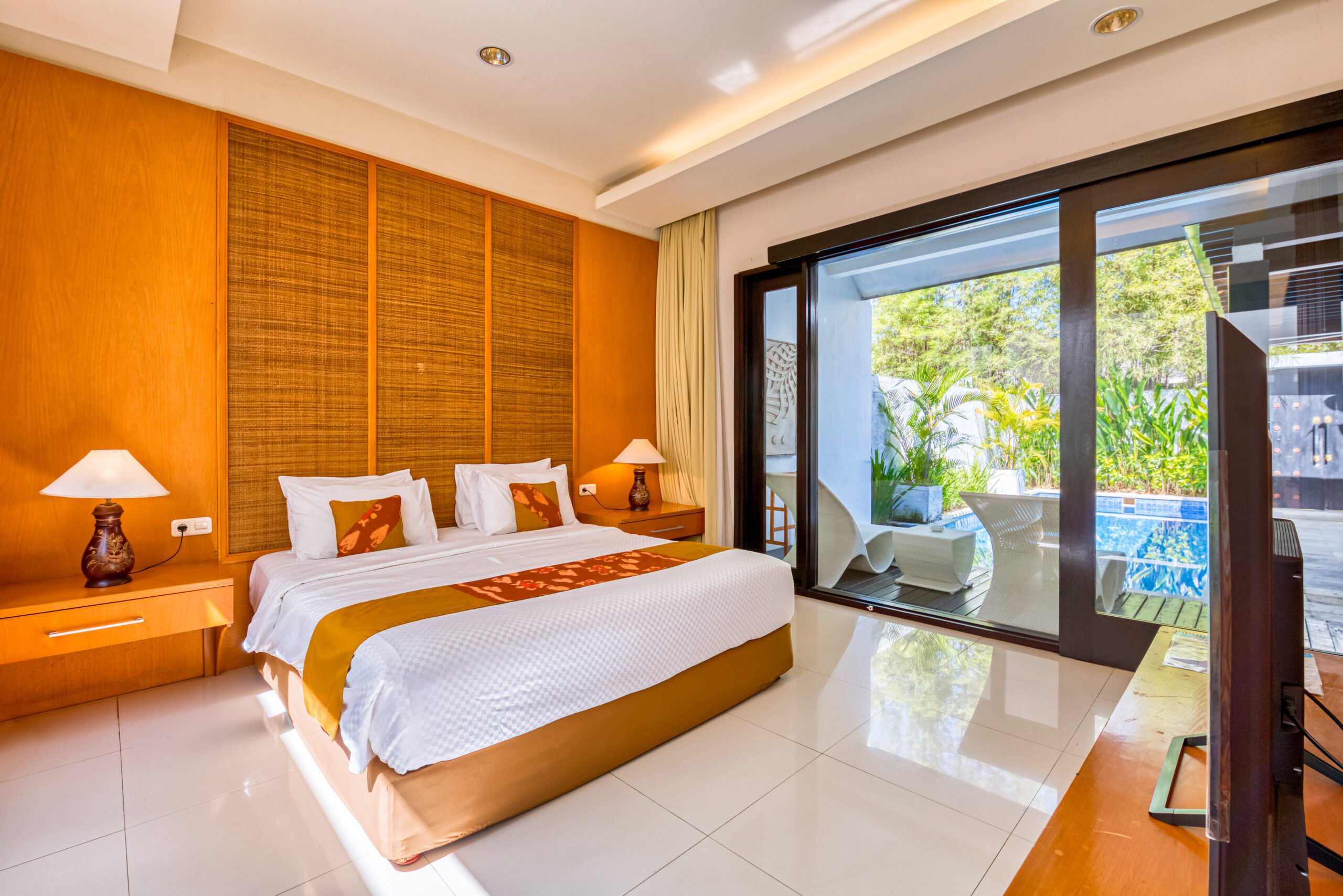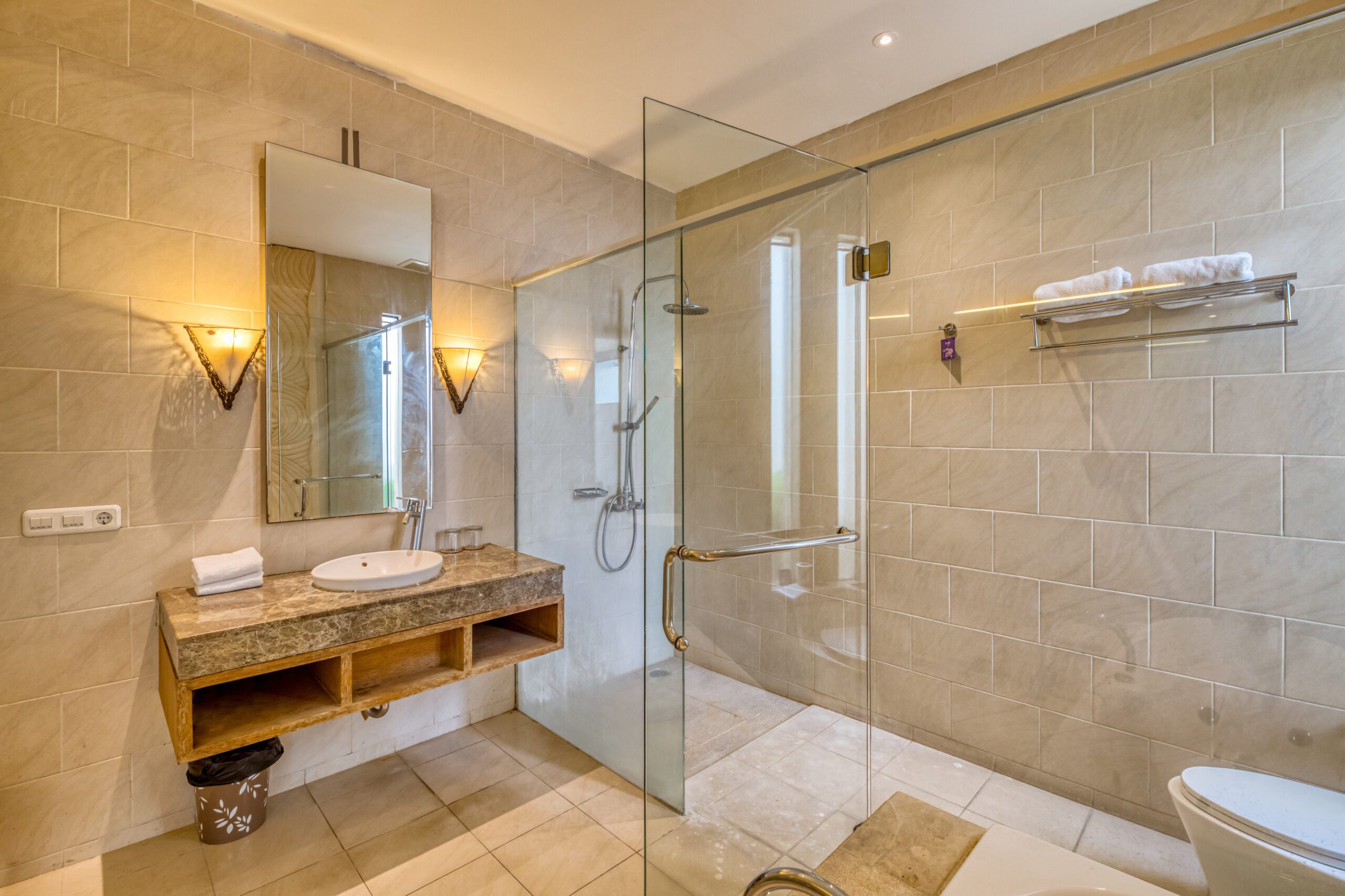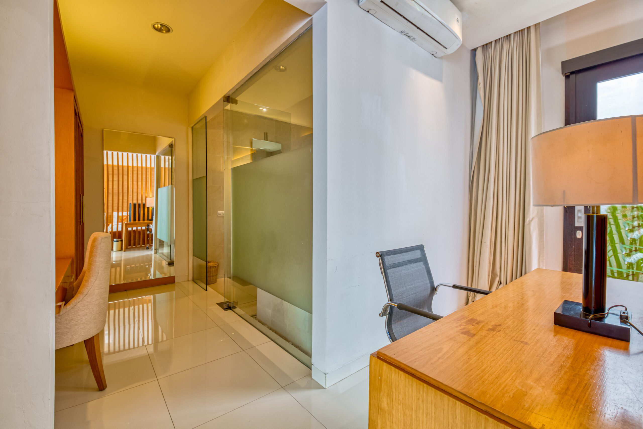 The villa holds two spacious bedrooms, each with its own king size bed and ensuite bathroom. The master bedroom has a flatscreen tv and a comfortable, slightly secluded desk. From the spacious wardrobe and vanity area you can directly access the ensuite master bathroom. This has a rain shower, toilet and separate whirlpool bathtub. The second bedroom also has its own flatscreen television. Its ensuite bathroom features a rain shower and a second toilet.