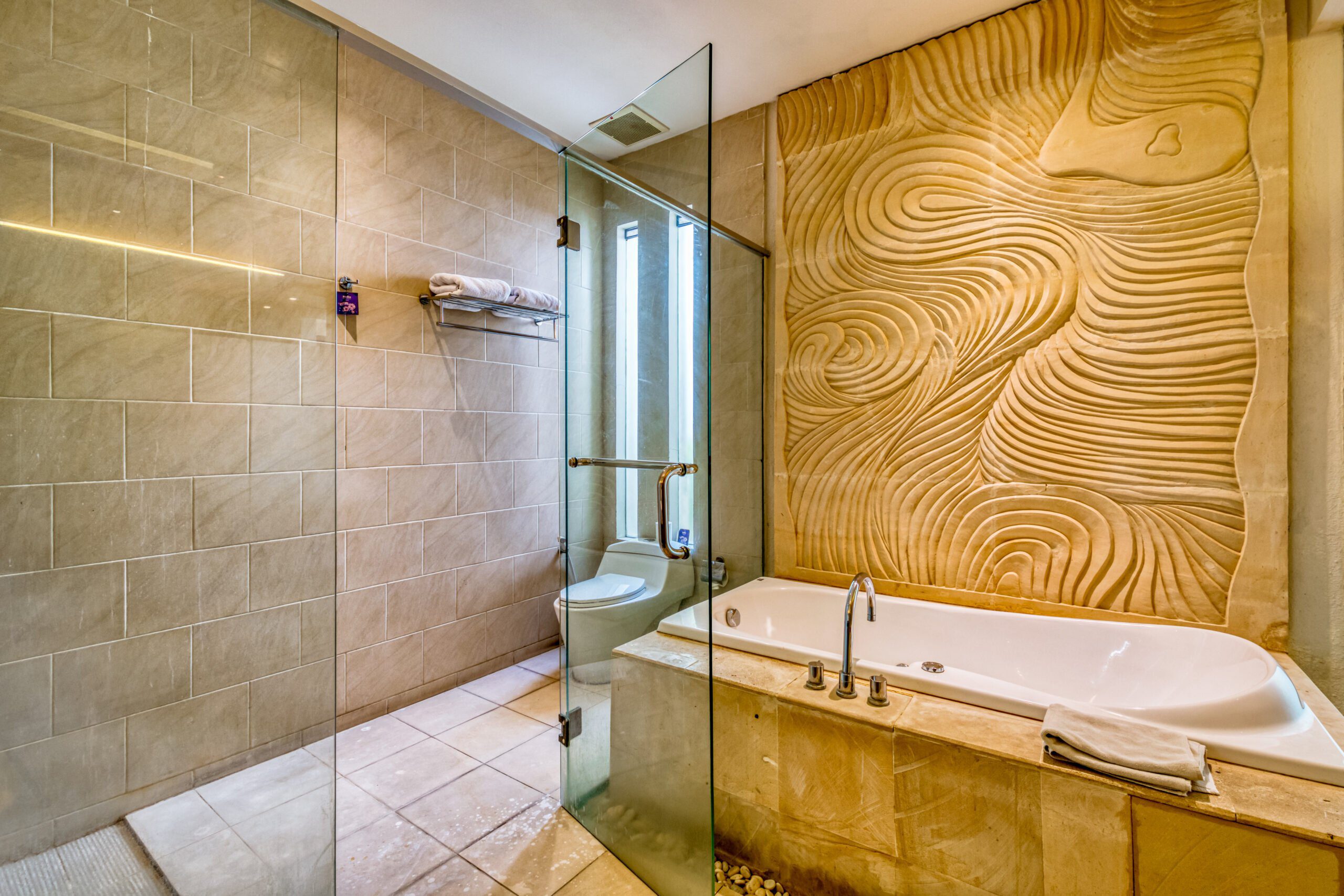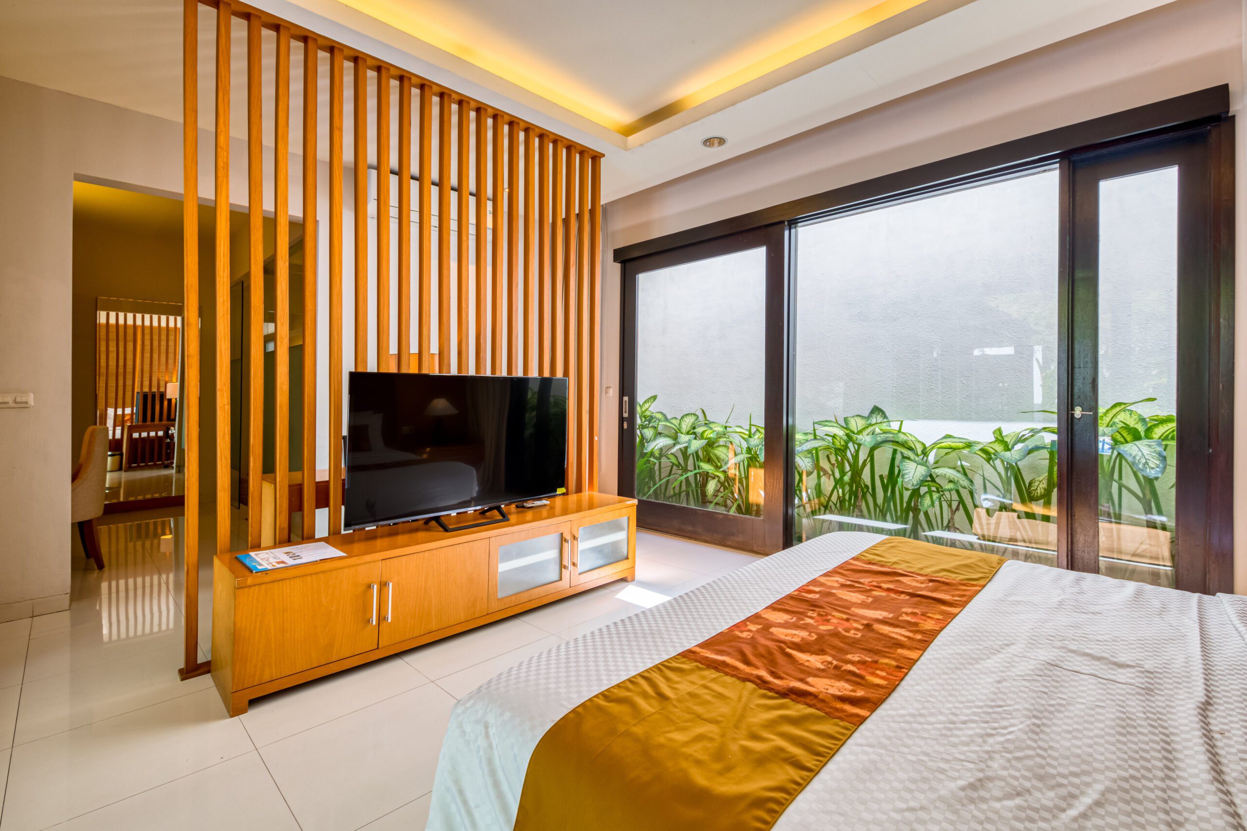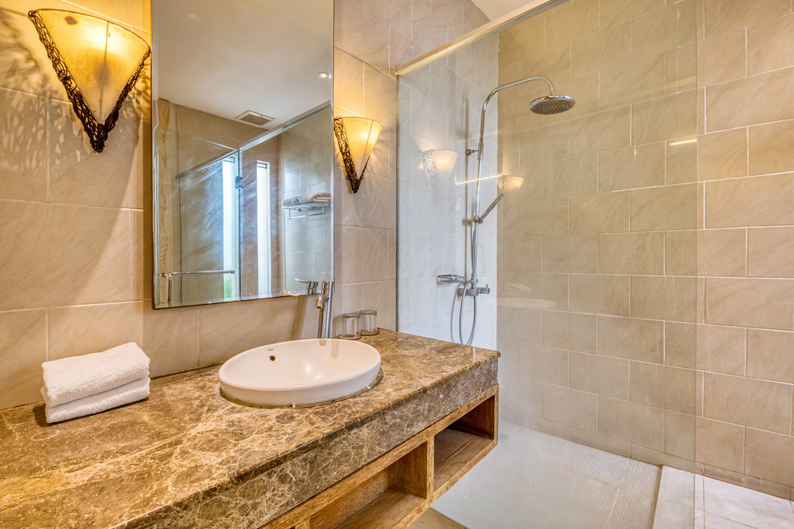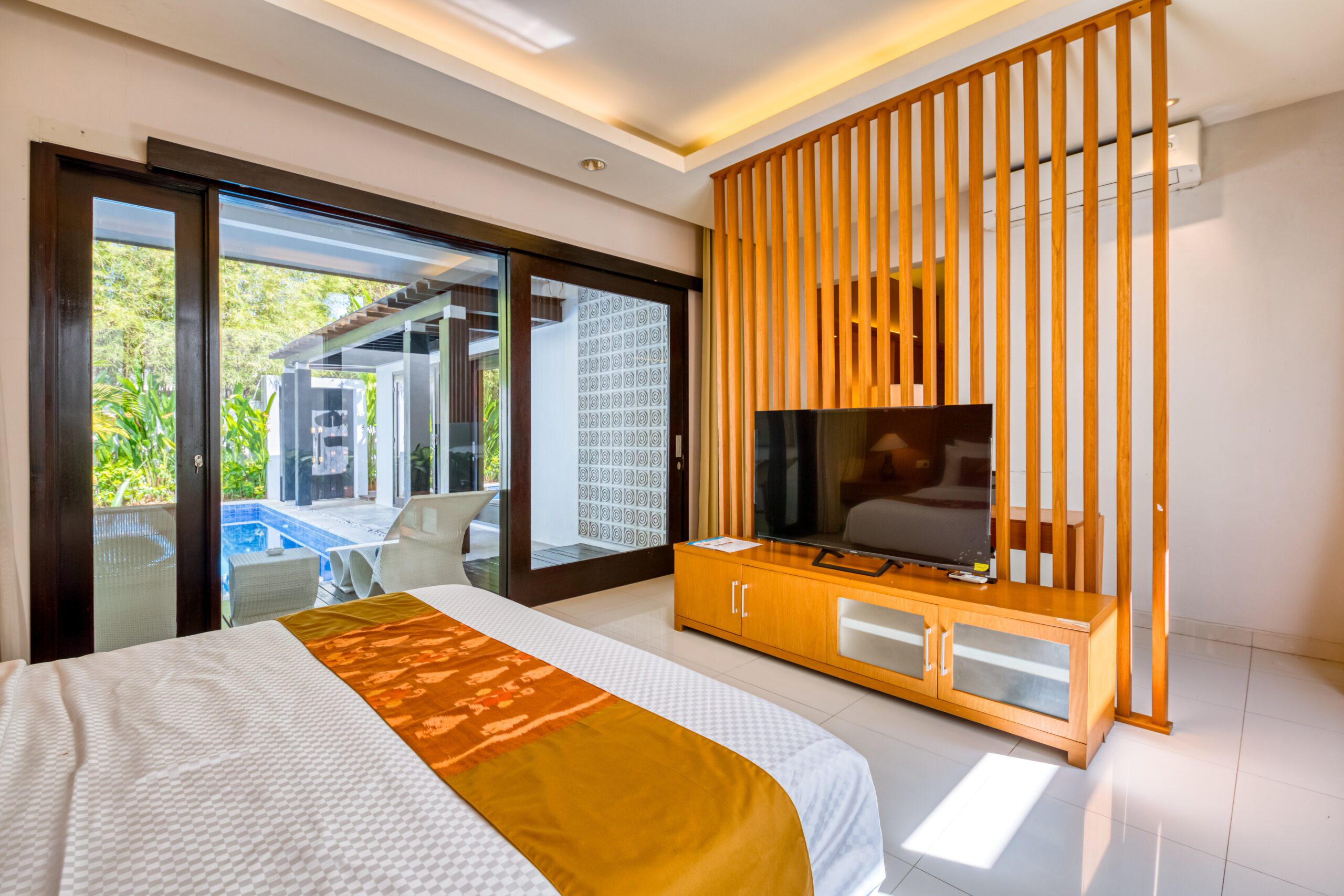 The villa holds two spacious bedrooms, each with its own king size bed and ensuite bathroom. The master bedroom has a flatscreen tv and a comfortable, slightly secluded desk. From the spacious wardrobe and vanity area you can directly access the ensuite master bathroom. This has a rain shower, toilet and separate whirlpool bathtub. The second bedroom also has its own flatscreen television. Its ensuite bathroom features a rain shower and a second toilet.