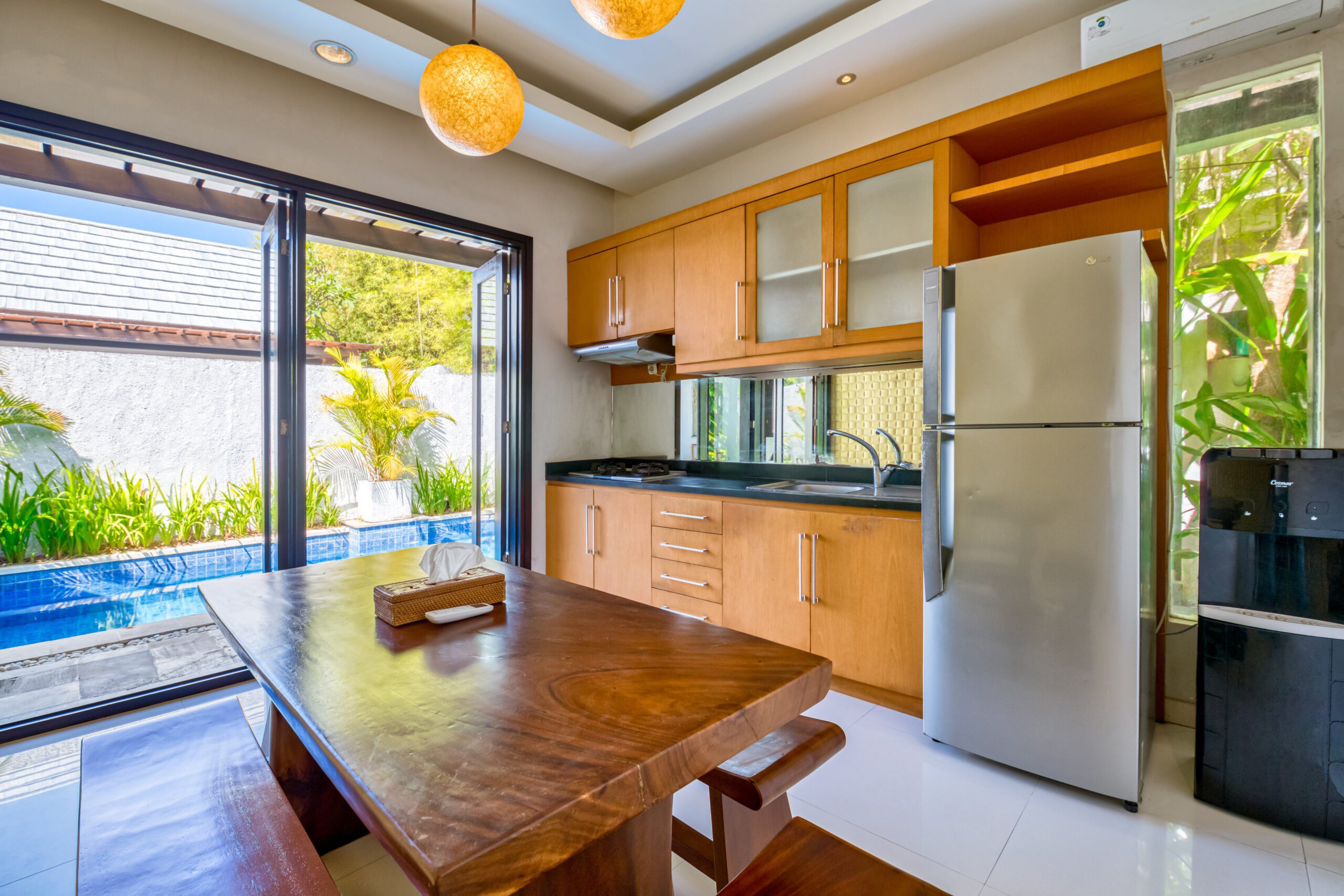 Vila Emas is a comfortable villa with a private pool and outside area. All rooms are equipped with an airconditioner. All rooms are separately accessible from outside with wide sliding doors. Firstly you encounter the kitchen which is equipped with a 2 burner stovetop, freezer, refrigerator and a watertank. The semi-open kitchen also features the dining area.
