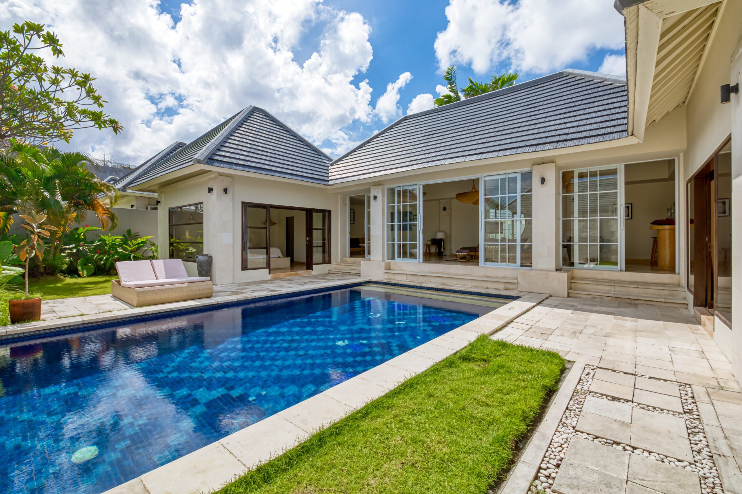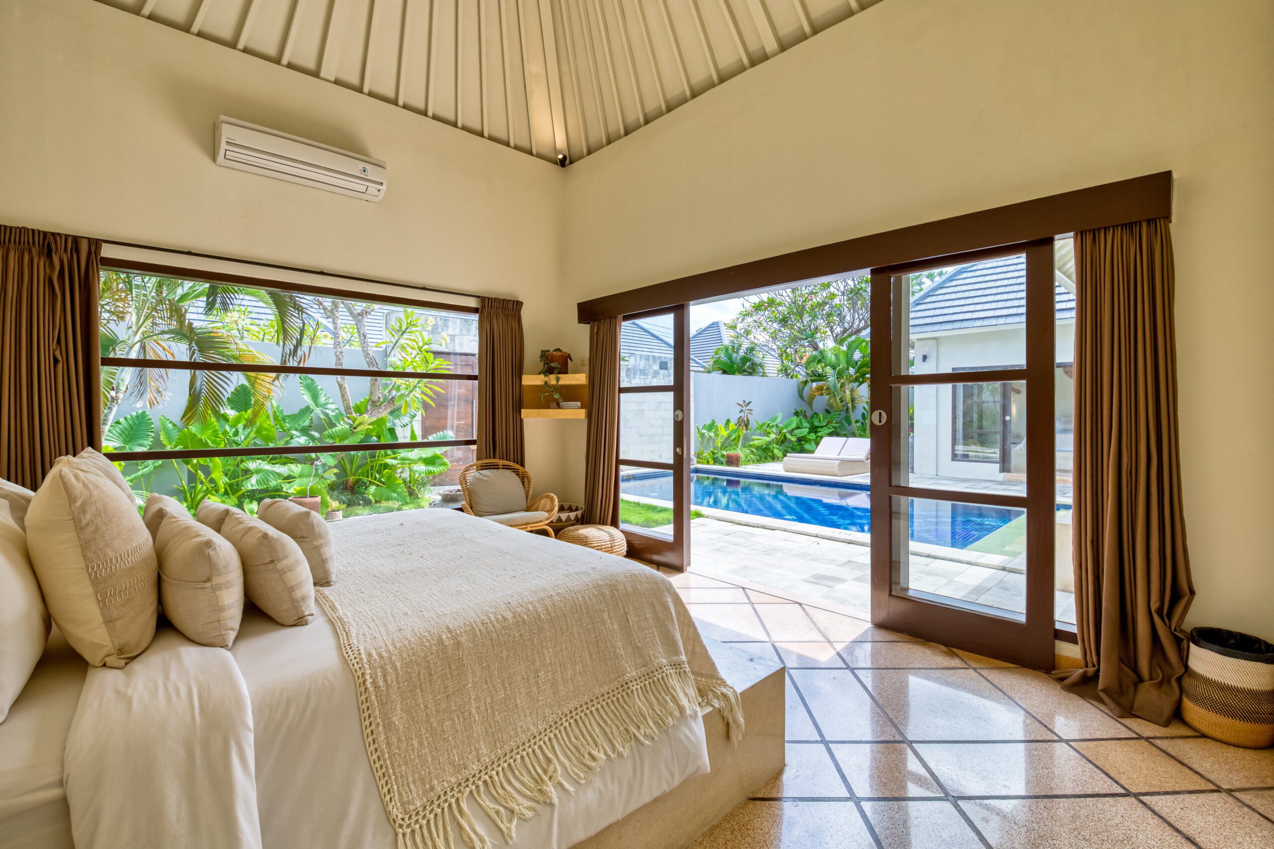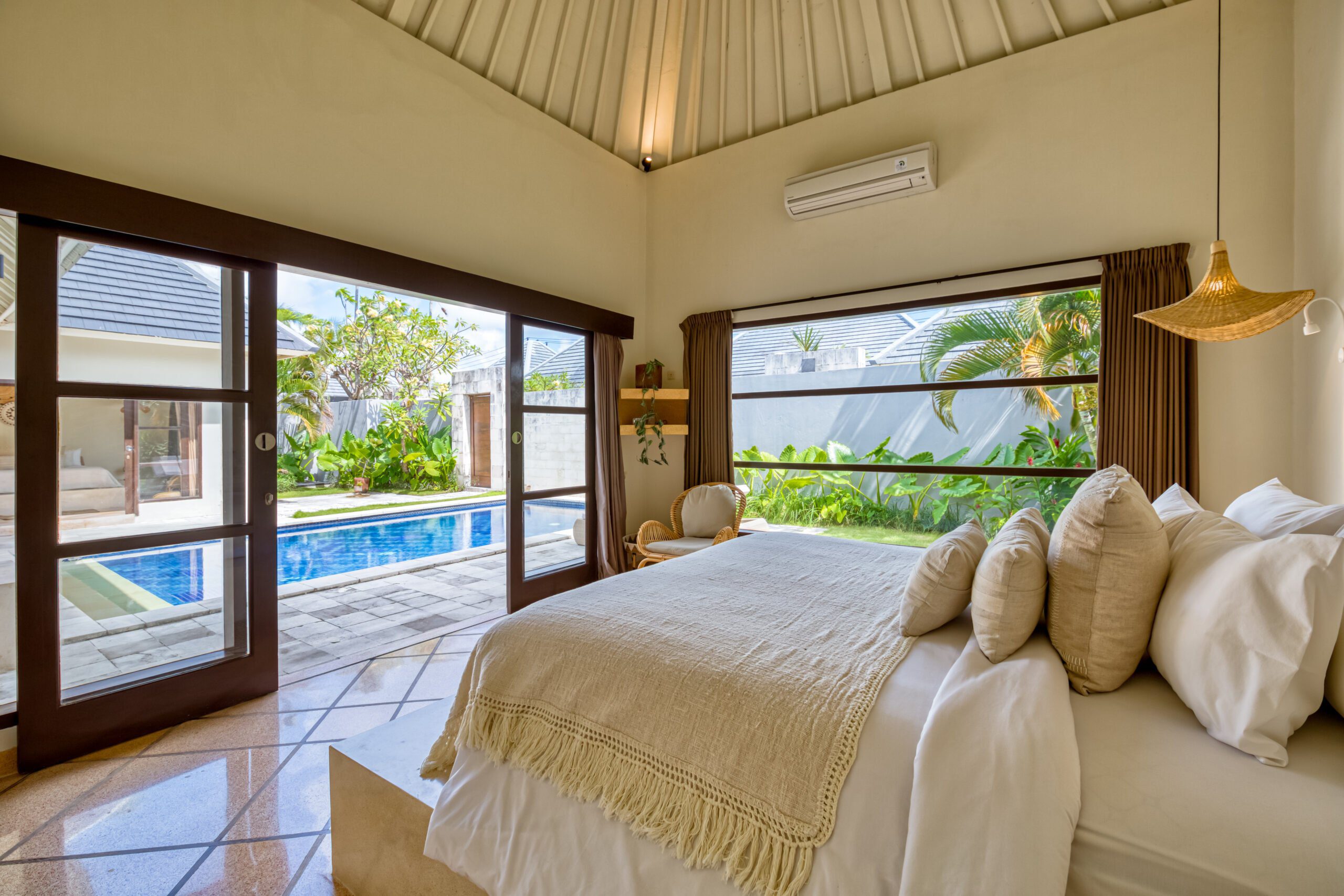 This spacious 200m2 villa offers everything you need to enjoy your well deserved and relaxing holiday in Bali. When you enter the property you are welcomed by the large swimming pool. Large sliding doors on your right hand side bring you to the first bedroom with a kingsize bed. This serene bedroom looks out onto the pool and the tropical garden that surrounds the villa. Continuing to the ensuite bathroom you’ll find a wardrobe and safety box. The bathroom offers a majestic shower/bathtub where you can completely refresh and unwind. It also features double wash basins and a toilet. Opposite this room, on the other side of the pool, you can find the second bedroom that shares all the same features. Both bedrooms and the living area in this 2 bedroom villa are equipped with airconditioning.