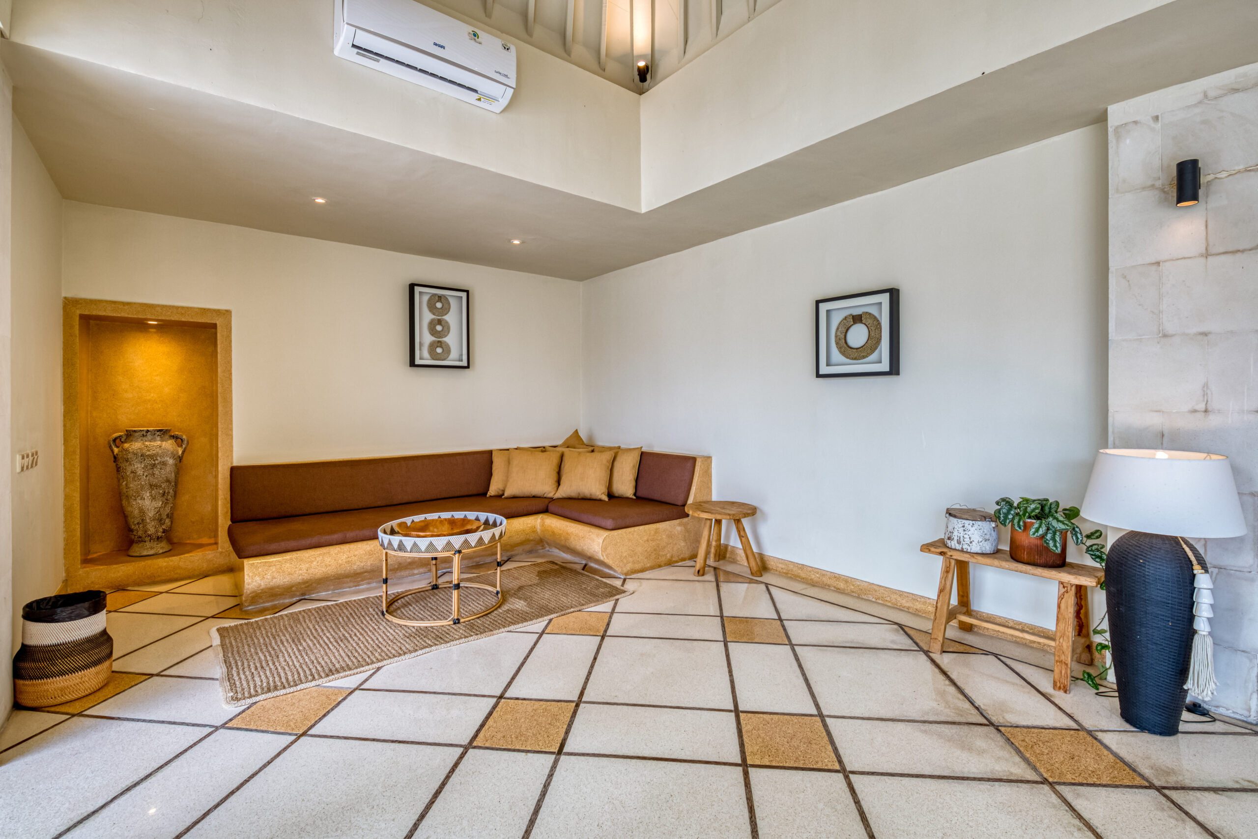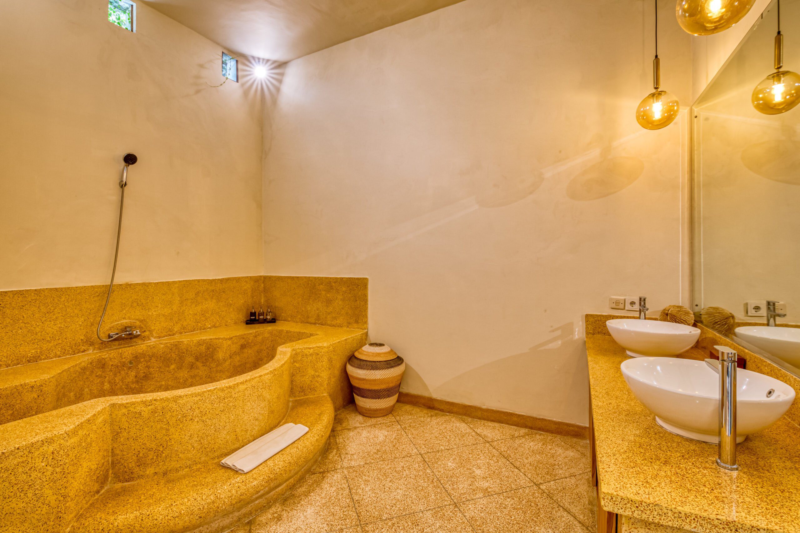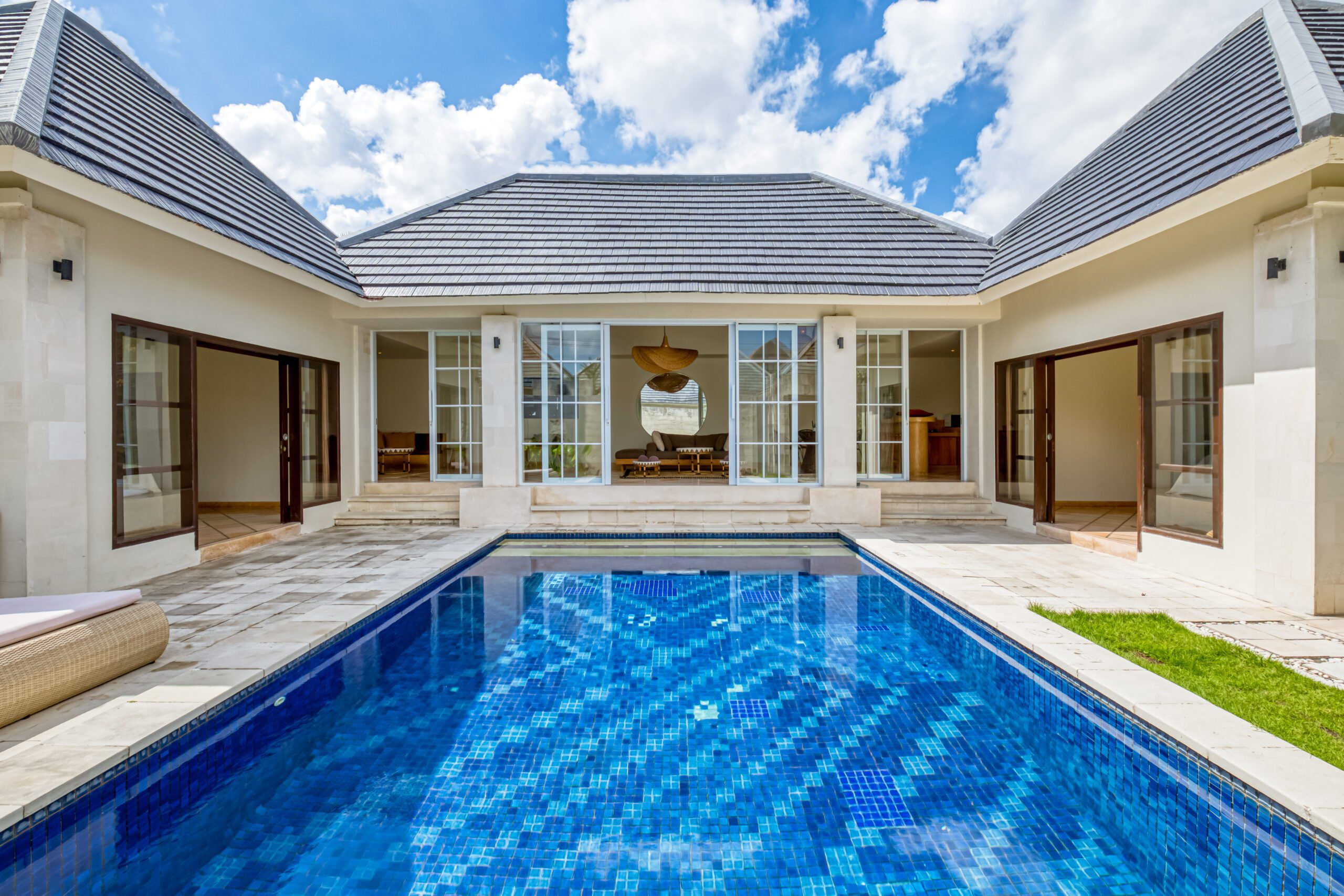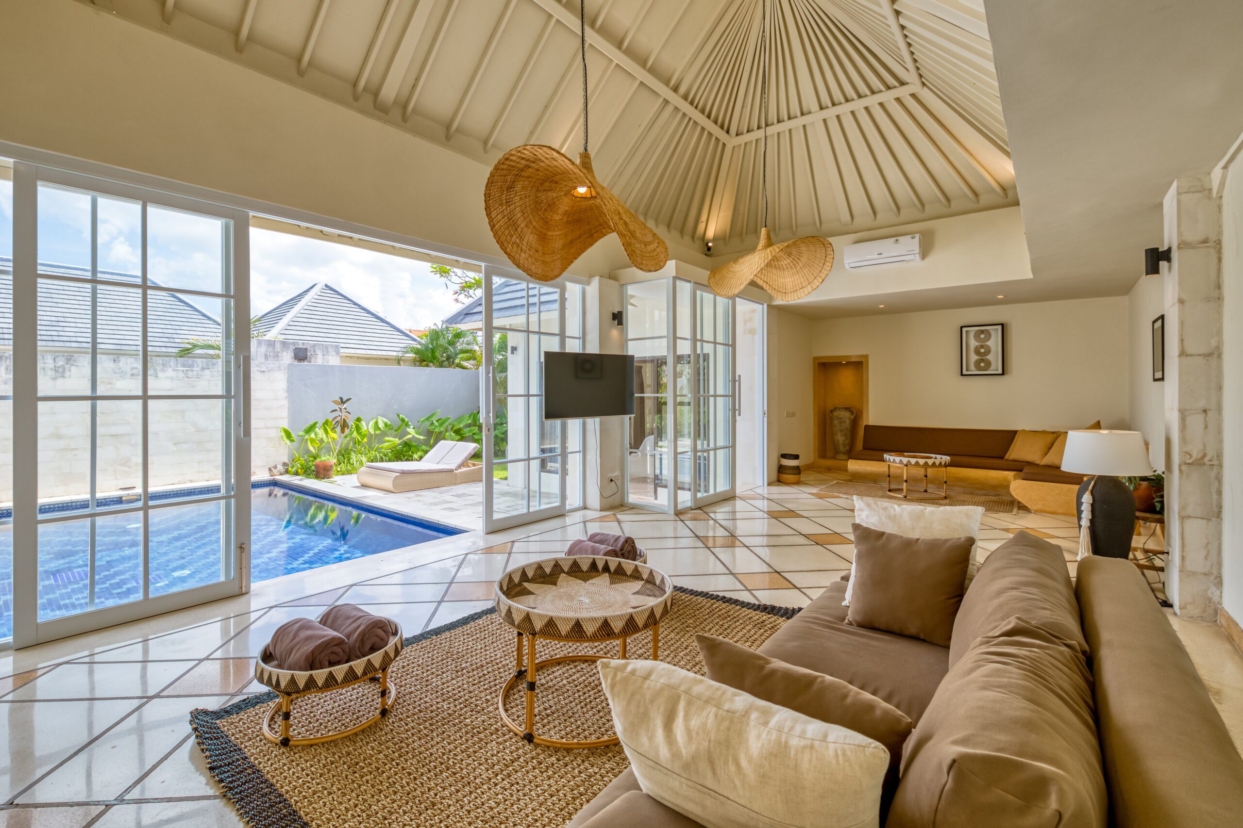 This spacious 200m2 villa offers everything you need to enjoy your well deserved and relaxing holiday in Bali. When you enter the property you are welcomed by the large swimming pool. Large sliding doors on your right hand side bring you to the first bedroom with a kingsize bed. This serene bedroom looks out onto the pool and the tropical garden that surrounds the villa. Continuing to the ensuite bathroom you’ll find a wardrobe and safety box. The bathroom offers a majestic shower/bathtub where you can completely refresh and unwind. It also features double wash basins and a toilet. Opposite this room, on the other side of the pool, you can find the second bedroom that shares all the same features. Both bedrooms and the living area in this 2 bedroom villa are equipped with airconditioning.
