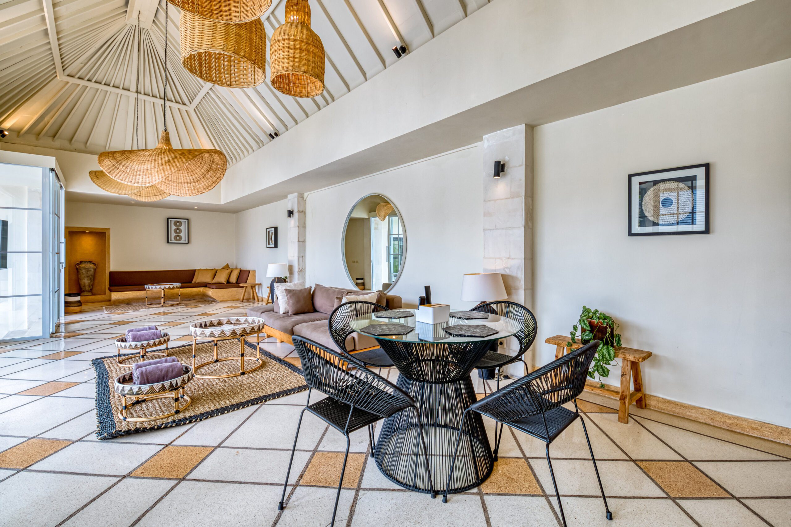 The living room offers two generous lounge areas. When completely opening the sliding doors it almost feels like you are sitting outdoors. The sofa is placed in the center of the living room and overlooks the swimming pool. The second lounge area is more cozily nestled in the corner of this room. The dining area is perfectly equipped to enjoy your meal. The kitchen features a 2 burner stovetop, freezer, refrigerator, microwave and a watertank.